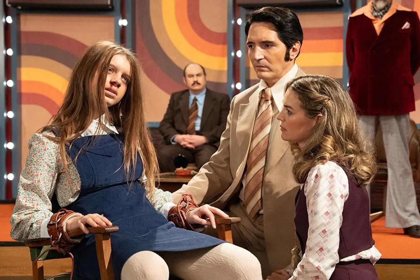 We’re loving the format and set-up for this film. The entire premise is intriguing, and is the reason we sought this movie out even before we knew Dastmalchian was involved. He’s beyond perfect for this part, and we feel that he has helped to elevate the entire cast of less experienced performers who are having to adopt American accents for the film. For an indie film, the entire production has done an amazing job making this a convincing and effective experience. The recreation of this era of television, right down to the archetypes of the celebrity psychic and magician of the era.